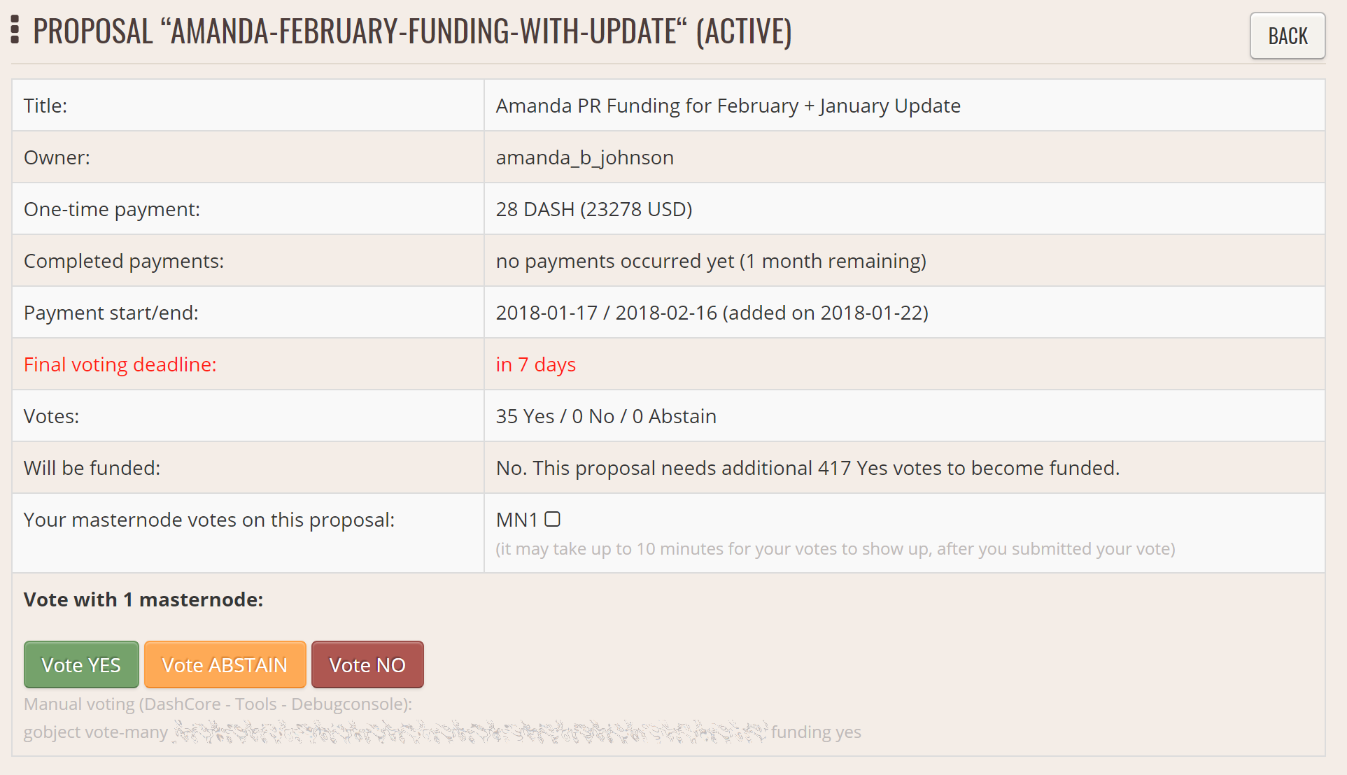 Once passed, proposals are able to report back to the network on the Dash Forum or via published public channels and social media. Since it is possible to create proposals that pay out over several months, it is also possible to revoke funding from a project by changing the vote if development or spending of already allocated funds is unsatisfactory. This encourages proposal owners to work honestly and diligently to win the trust and approval of the network. Ongoing discussion and gradual improvement over time results in a close bond between the network and those working for the network in supporting roles.