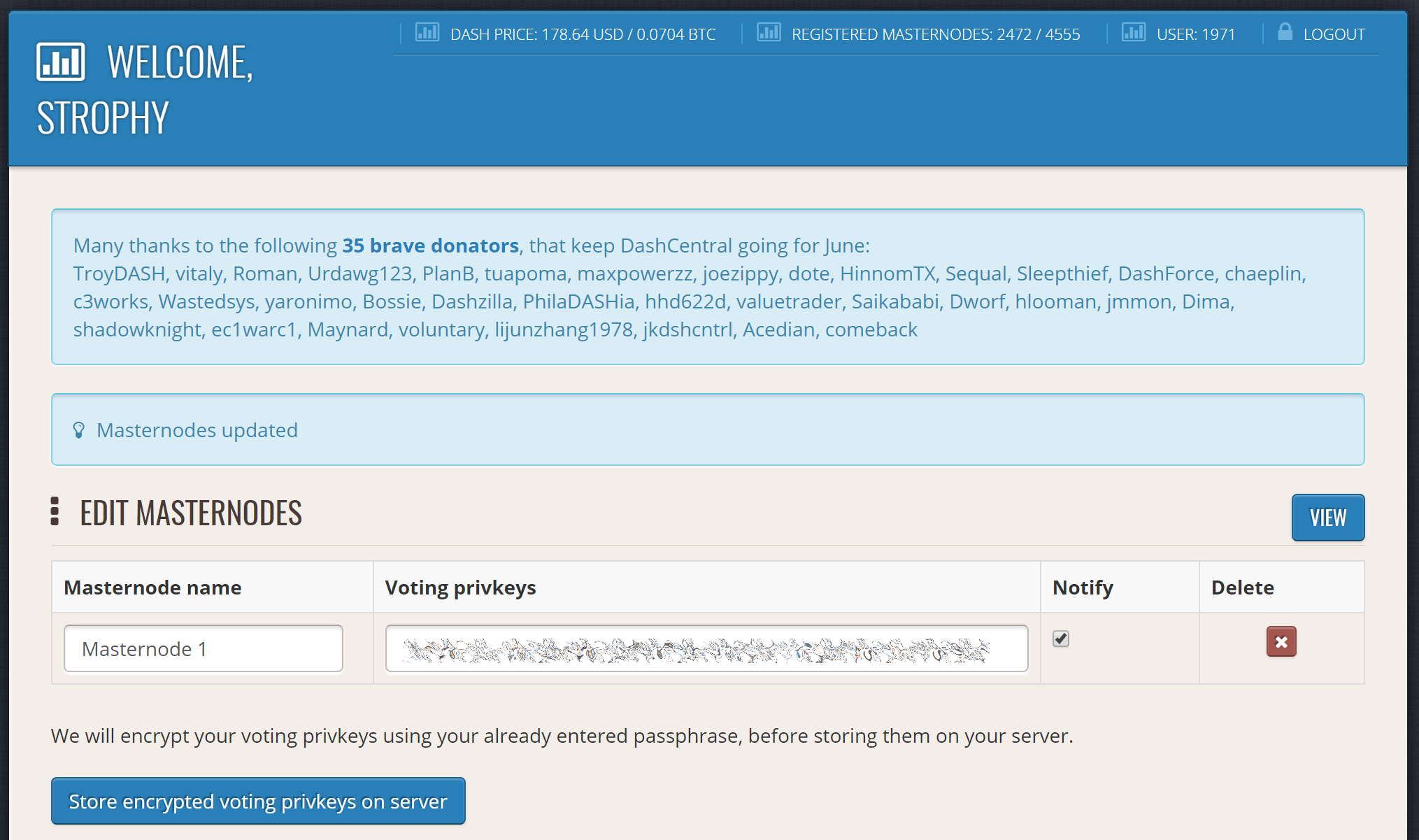 It is important to note that the private key to start your masternode is unrelated to the private keys to the collateral address storing your 1000 DASH. These keys can be used to issue commands on behalf of the masternode, such as voting, but cannot be used to access the collateral. The keys are encrypted on your device and never stored as plain text on DashCentral servers. Once you have entered the key, click Store encrypted voting privkeys on server. You can now vote on proposals from the DashCentral web interface.