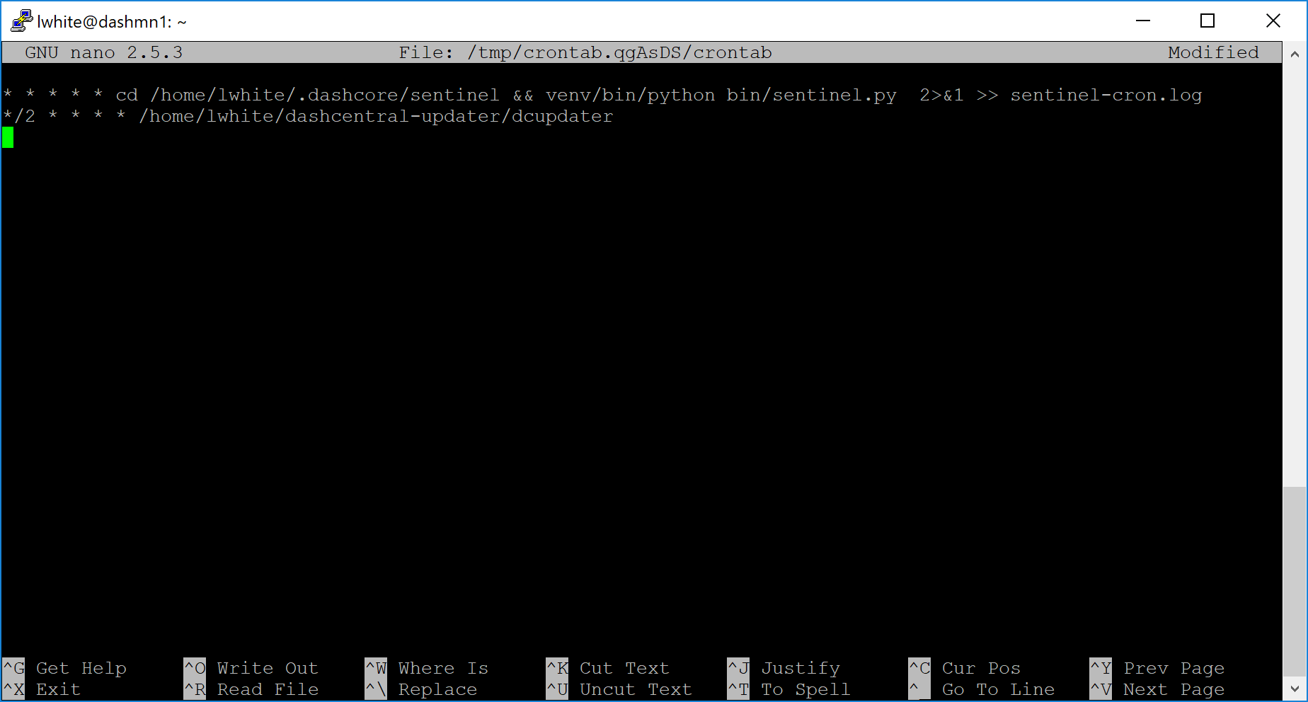 Once you have verified your configuration is working, we can edit the crontab on your system to schedule the dcupdater script to run every 2 minutes. This allows the system to give you early warning in the event of a fault and will even restart the dashd daemon if it hangs or crashes. This is an effective way to make sure you do not drop off the payment queue. Type the following command: