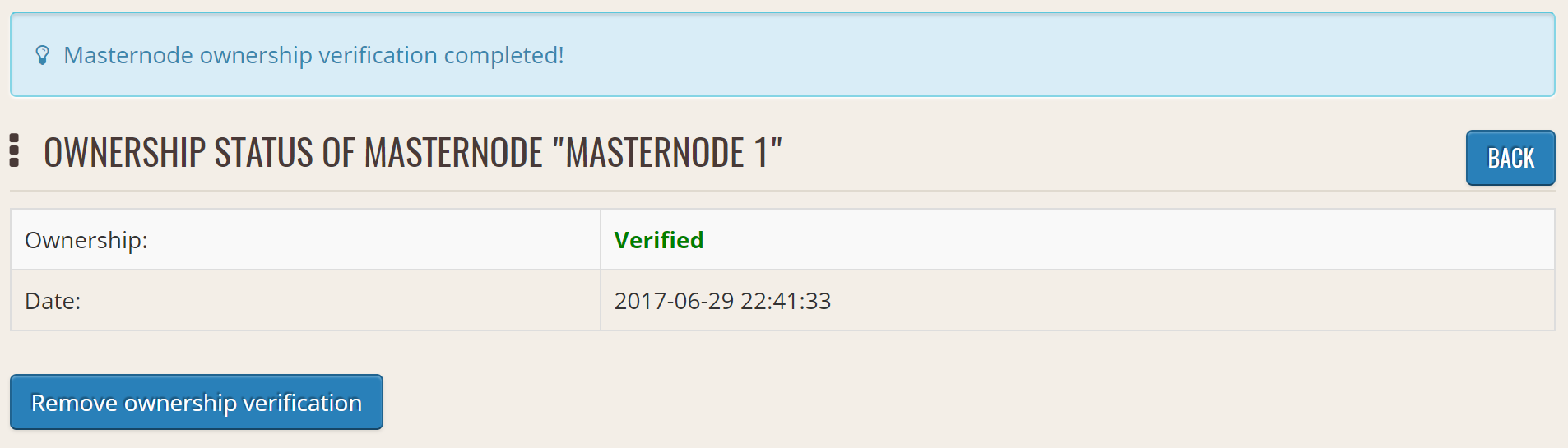 You can also issue a message from your address to verify ownership of your masternode to DashCentral. Click Unverified under Ownership and the following screen will appear: