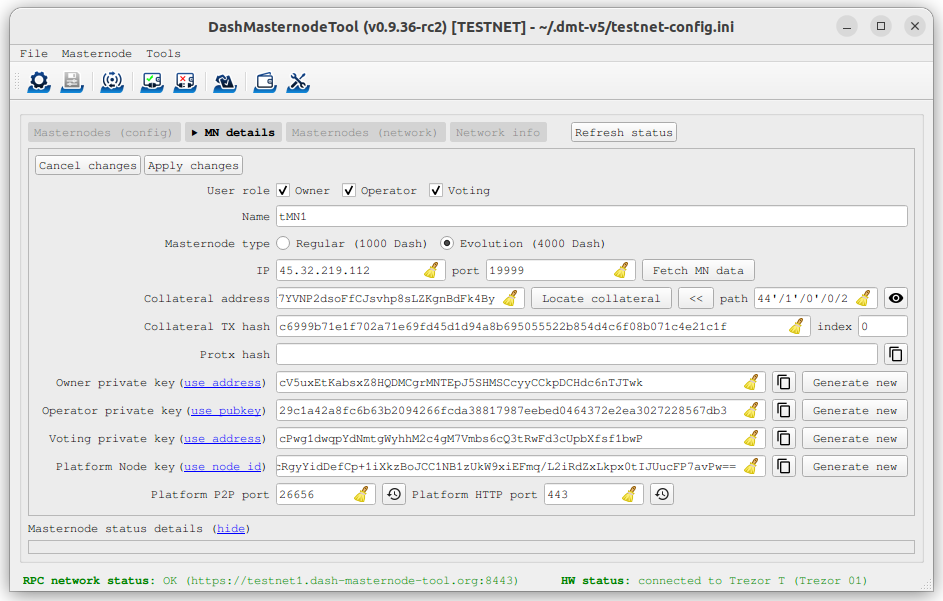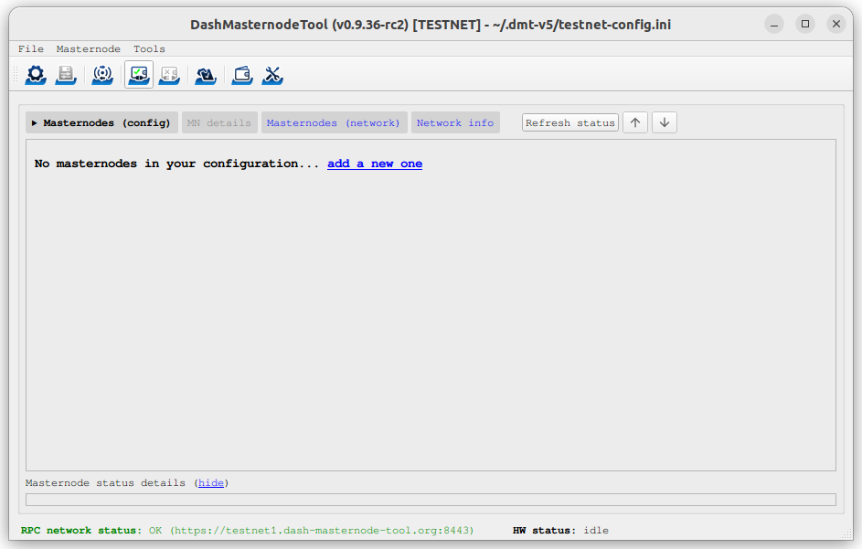 Click the third button from the left Check Dash Network Connection in the top left corner of the main window to verify that the connection is working. Then connect your Trezor device and click the next button Test Hardware Wallet Connection to verify the hardware wallet connection is working.