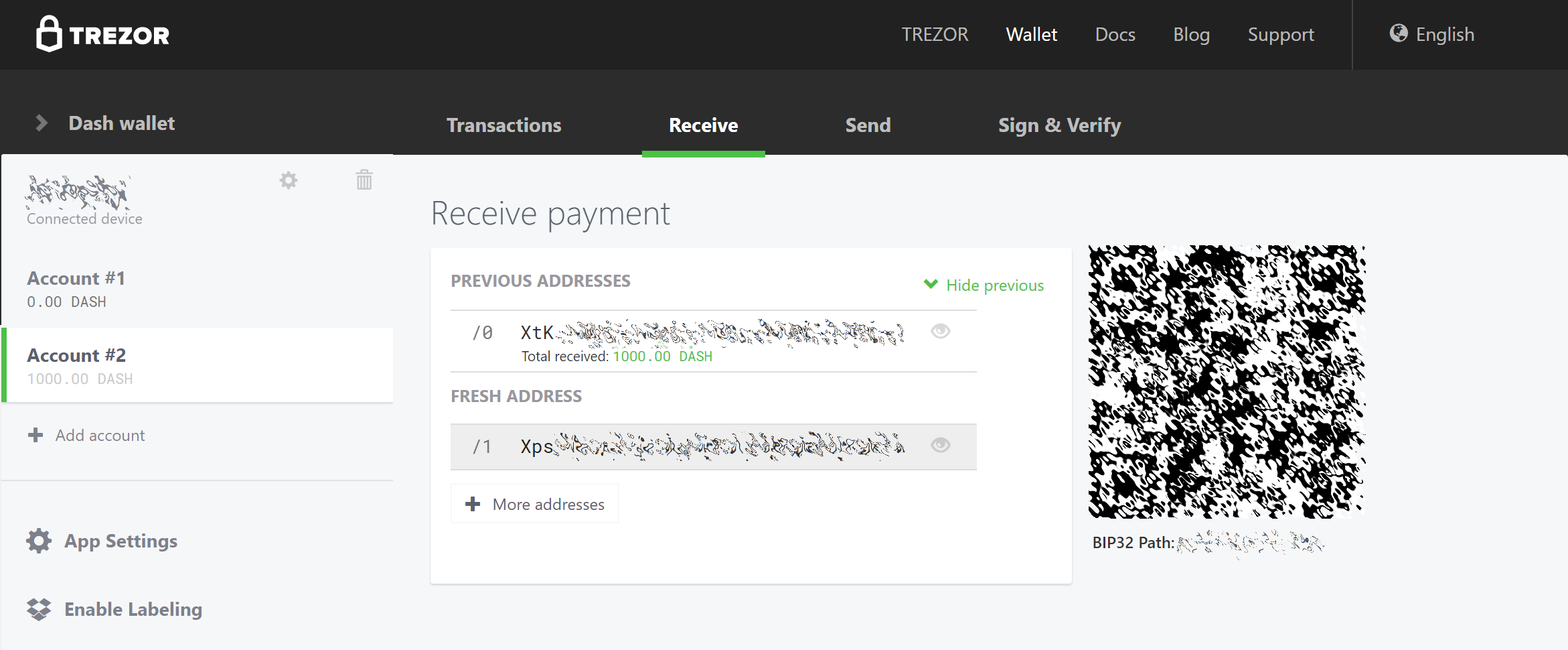 Set up your Trezor using the Trezor wallet at https://wallet.trezor.io/ and send a test transaction to verify that it is working properly. For help on this, see this guide - you may also choose to (carefully!) add a passphrase to your Trezor to further protect your collateral. Create a new account in your Trezor wallet by clicking Add account. Then click the Receive tab and send exactly 1000 DASH to the address displayed. If you are setting up multiple masternodes, send 1000 DASH to consecutive addresses within the same new account. You should see the transaction as soon as the first confirmation arrives, usually within a few minutes.