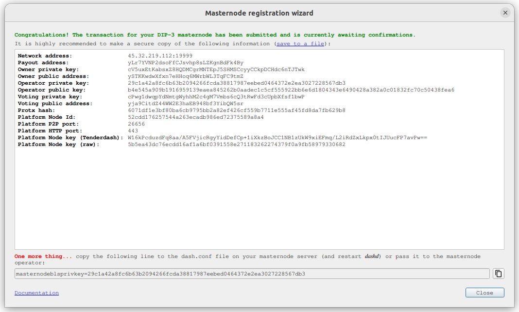 tx: The serialized transaction previously returned in thetxoutput field from theprotx register_preparecommandsig: The message signed with the collateral key from thesignmessagecommand