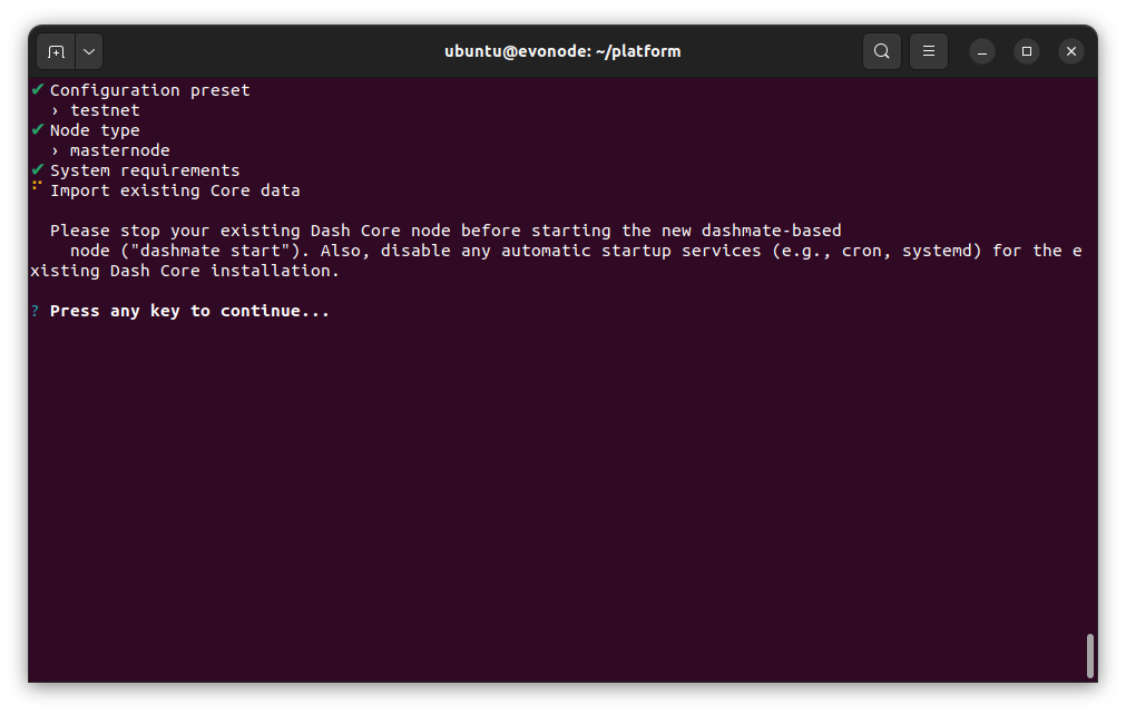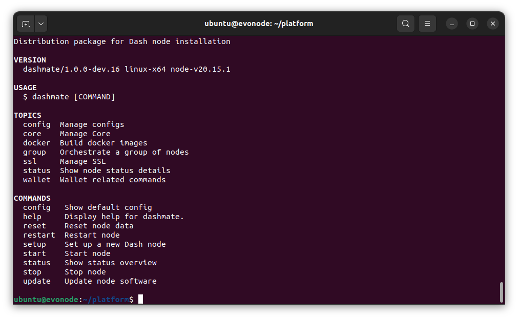 Dashmate is primarily recommended for setting up Evolution masternodes (evonodes). With the exception of a few minor extra steps for evonodes, the process is identical for evonodes and regular masternodes. Complete the steps in the sections below to set up your node or follow along with this step-by-step tutorial.