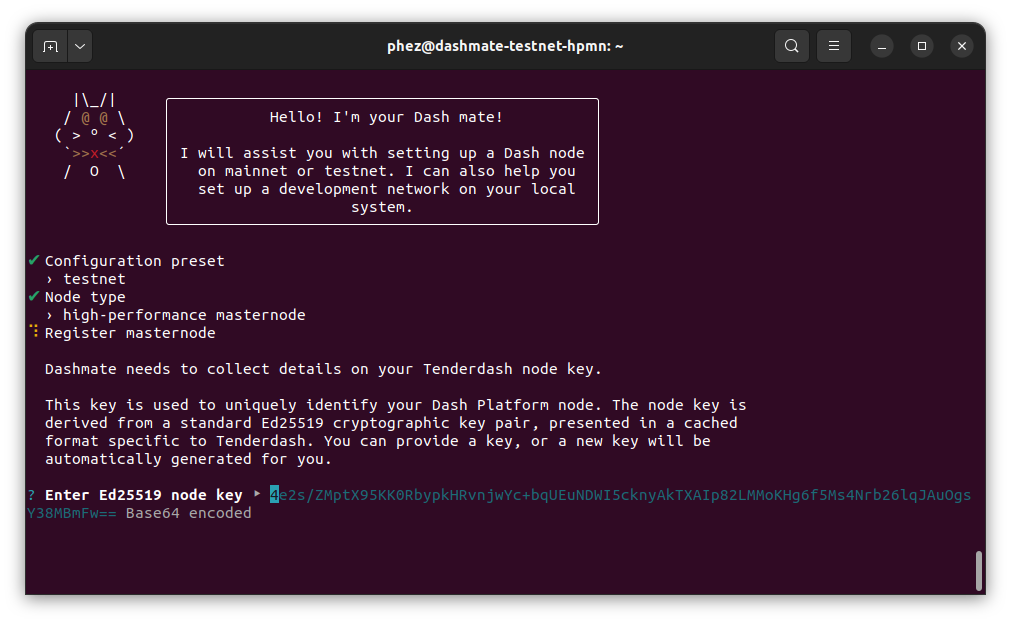 To begin masternode setup, run dashmate setup to start the interactive wizard: