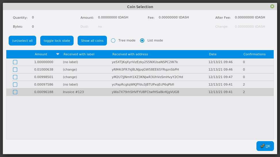 Coin Selection window in Dash Core wallet, showing two masternodes (testnet)#