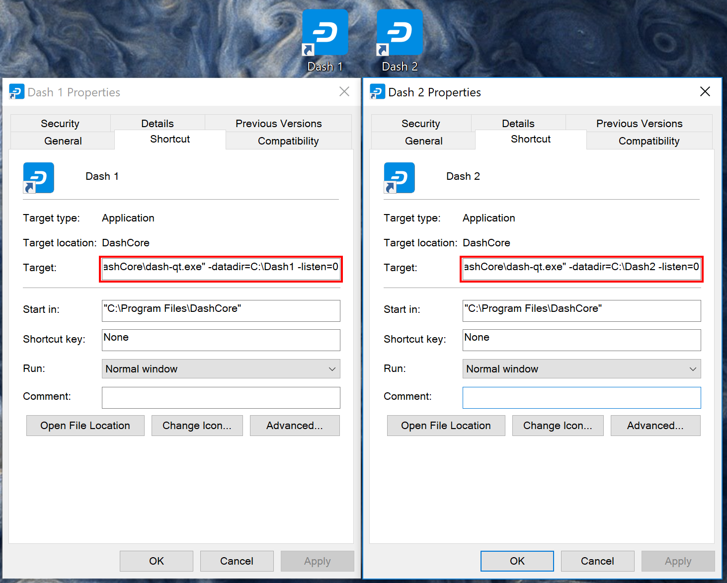 "C:\Program Files\DashCore\dash-qt.exe" -datadir=C:\Dash1 -listen=0Datadir Target 2: