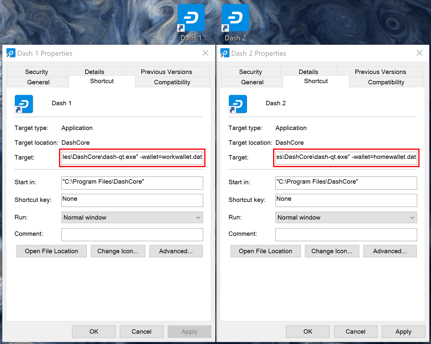 instances of Dash Core simultaneously. Create two (or more) shortcuts on