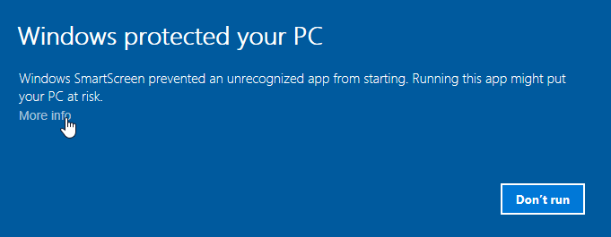 At this point, you may see a warning from Windows SmartScreen that the app is unrecognized. You can safely skip past this warning by clicking More info, then Run anyway.