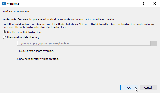 Once installation is complete, Dash Core will start up immediately. If it does not, click Start > Dash Core > Dash Core to start the application. The first time the program is launched, you will be offered a choice of where you want to store your blockchain and wallet data. Choose a location with enough free space, as the blockchain can reach 45GB+ in size. It is recommended to use the default data folder if possible.