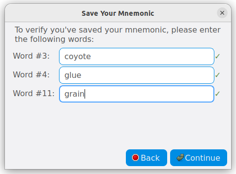 As you enter each word correctly, a green checkmark will appear beside it. Once you have successfully verified your mnemonic, click Continue to complete the wallet creation process.