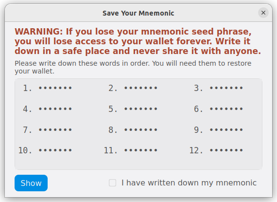 Click the Show button to reveal your mnemonic phrase. Then, write down all the words in order and check the “I have written down my mnemonic” checkbox to continue.